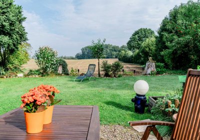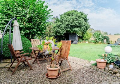- Garage mit einem PKW-Stellplatz, große Terrasse mit Blick auf Felder