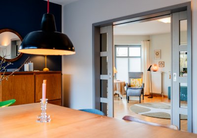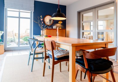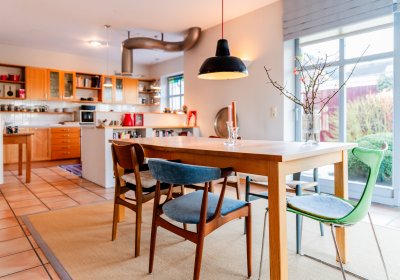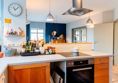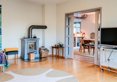 Der offene Lebensbereich verbindet Wohn-, Koch- und Essplatz harmonisch miteinander. Die offene Küche fügt sich nahtlos ins Esszimmer ein und bietet viel Platz für gemeinsame Kochmomente, Barabende oder das Zubereiten von Familienmahlzeiten. Der charmante Ofen im Wohnzimmer setzt zusätzlich stilvolle, wohnliche Akzente: Romantik und Wärme an kühlen Abenden, dazu eine behagliche Atmosphäre, die zum Entspannen einlädt. Ob beim Frühstück an der Küchenzeile, beim gemütlichen Abendessen oder beim Lesen am Feuer – hier entsteht ein zentraler Ort des Zusammenkommens.