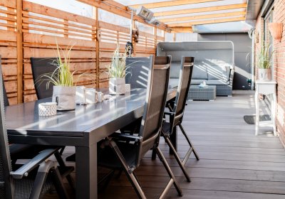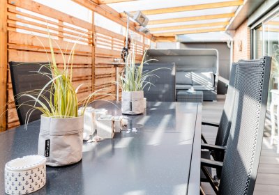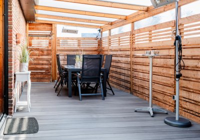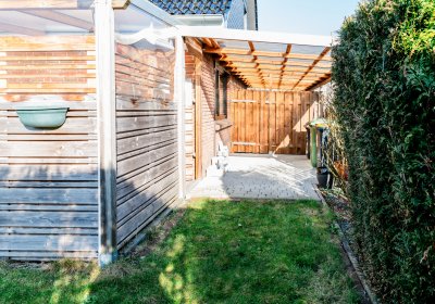 Besonders charmant: Der kleine, pflegeleichte Garten, der sich fast wie ein großes, gemütliches "Outdoor-Wohnzimmer" anfühlt. Ein großer Teil ist überdacht und schafft eine private, wettergeschützte Wohlfühloase.