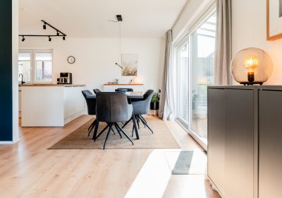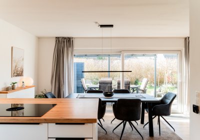Die Raumaufteilung ist durchdacht und zugleich angenehm offen gestaltet. Im Erdgeschoss bildet der Wohn- und Essbereich mit direktem Zugang zur sonnig ausgerichteten Terrasse den Mittelpunkt des Hauses – ein Ort, an dem sich der Alltag ganz selbstverständlich nach draußen erweitert. Die angrenzende Küche ist nicht nur funktional, sondern lädt dazu ein, gemeinsam Zeit zu verbringen. Weitere Räume auf dieser Ebene bieten Flexibilität für unterschiedliche Lebenssituationen – ob als Rückzugsort, Arbeitsbereich oder Schlafzimmer.