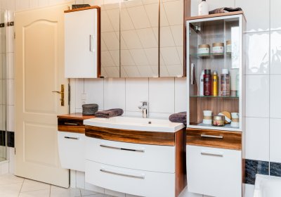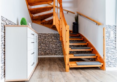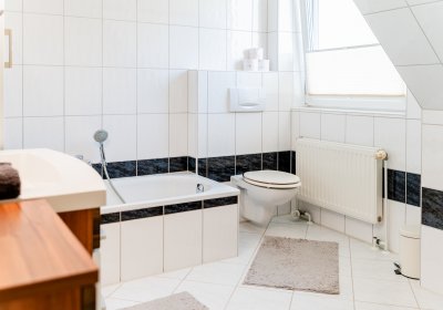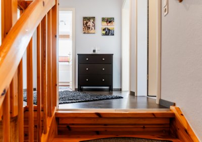 - Dachgeschoss: Flur, drei Zimmer, Badezimmer mit Dusche und Badewanne